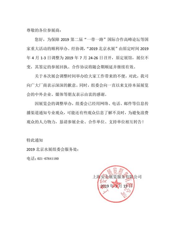 接展會主辦方緊急通知,萬泓環(huán)保原定于北京4月1-3日的國際水展時間向后推遲,望廣大客戶朋友們看到后相互轉(zhuǎn)告。因此給您造成的不便敬請見諒!鐵碳填料于2019年7月再行展出,后期我們會再行發(fā)布邀請函。感謝您的關(guān)注!