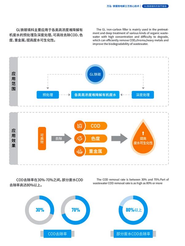 主要應用于各類高濃度難降解有機廢水的預處理及深度處理,可有效去除COD、色度,提高廢水可生化性。